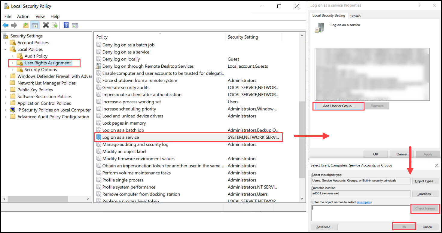 - Navigate to Security Settings > Local Policies > User Rights Assignment > Log on as a service.