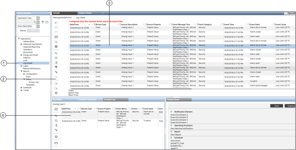 Der Arbeitsbereich Log-Viewer enthält Informationen zu Elementen der Benutzeroberfläche der Applikation Log-Viewer.