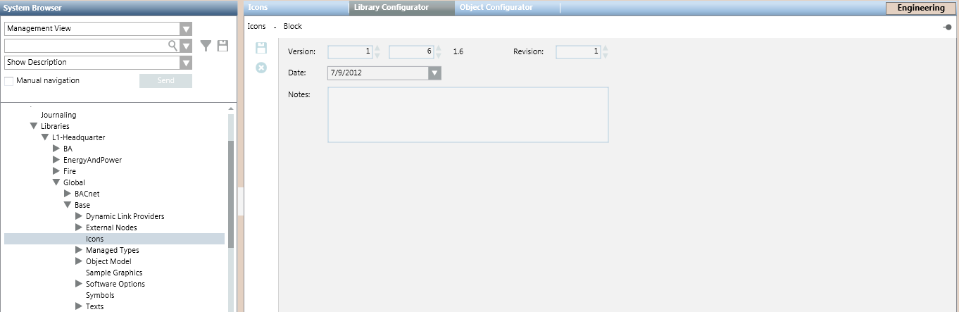 Wenn Sie einen Bibliotheksbaustein (z.B. Symbole) auswählen, werden im Register Bibliotheks-Konfigurator die Versionsinformationen des Bausteins angezeigt. Von hier aus können autorisierte Experten diese Informationen bei Bedarf aktualisieren oder den Baustein ganz löschen.