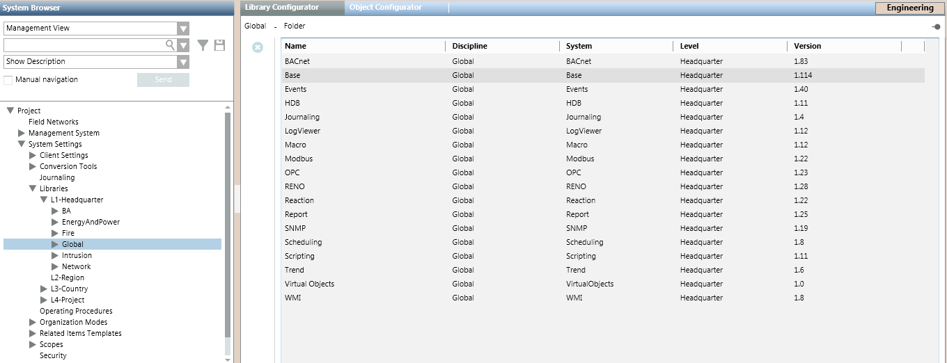 Wenn Sie eine der Bibliotheksebenen wählen (L1-Headquarter, L2-Region, L3-Country oder L4-Project), zeigt das Register Bibliotheks-Konfigurator eine Liste aller Bibliotheken der betreffenden Ebene an.