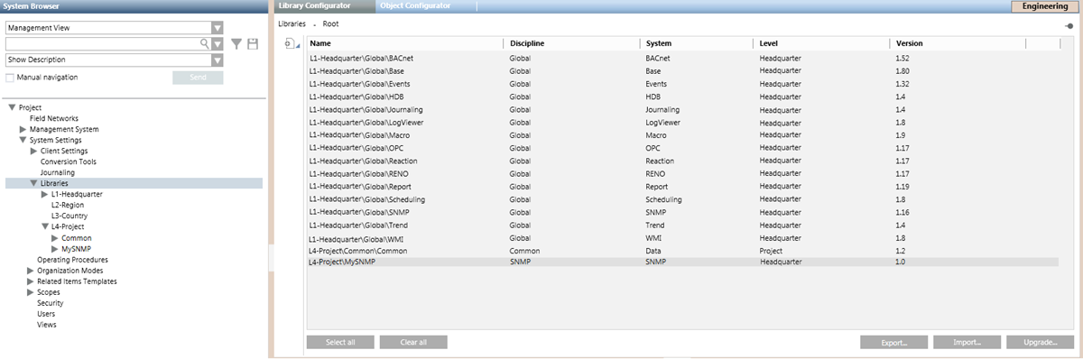 - Wenn der Import vollständig abgeschlossen ist, wird die SNMP-Bibliothek unter der jeweiligen Bibliotheksebene und dem jeweiligen Ordner im System Browser angezeigt.