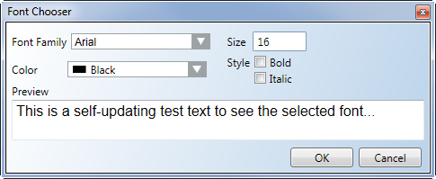 Im Fenster Schriftartenauswahl können Sie die Schrifteinstellungen für Text in den Kopf- und Fusszeilenfeldern eines Dokuments anpassen. Vorgenommene Einstellungen werden zusammen mit den Kopf- und Fusszeileneinstellungen in den Benutzereinstellungen gespeichert.