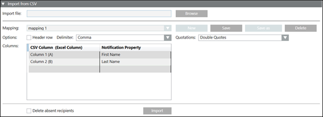 - Delete absent recipients: Löscht bestehende Empfänger, die in der CSV-Datei nicht enthalten sind und mit demselben Importtyp (CSV) und einer Abbildung importiert werden.