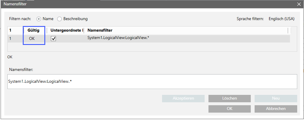 b. Überprüfen Sie im Dialogfeld Namensfilter den vordefinierten Pfad auf Gültigkeit und ändern Sie ihn bei Bedarf. In der Spalte Gültig mussOKangezeigt werden.