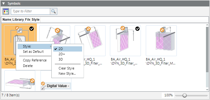 - Definieren Sie den Bibliotheksstil, indem Sie auf das gewünschte Symbol rechtsklicken und Stil: > 2D, 2D+ oder 3D.
