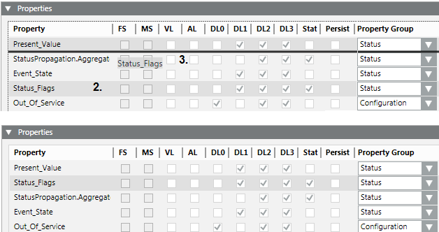 - Markieren Sie das Kontrollkästchen VL, um das Werte-Logging für diese Eigenschaft zu aktivieren.