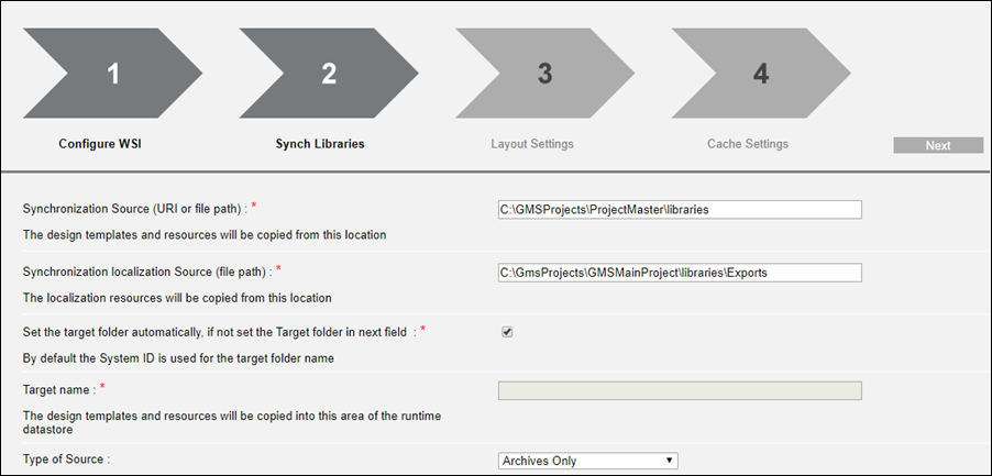 - Geben Sie im Feld Synchronisationsquelle (URL oder Dateipfad) den Pfad zum Bibliotheksordner Ihres Projekts ein. Zum Beispiel [Installationslaufwerk]:\[Installationspfad:]\[Projektname]\libraries.