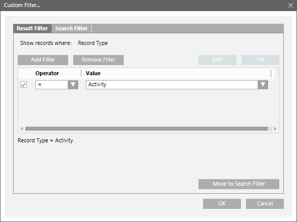 Im Dialogfeld Benutzerdefinierter Filter können Sie Ergebnis- oder Suchfilterausdrücke für eine bestimmte Spalte definieren. Sie können auf dieses Dialogfeld zugreifen, indem Sie Folgendes tun: