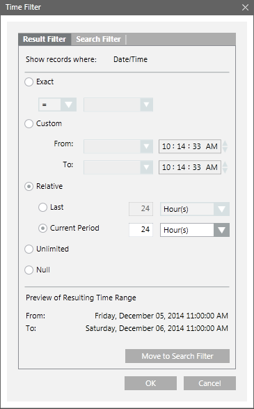 Dieses Dialogfeld erlaubt es Ihnen, Resultate- und Suchfilterausdrücke für eine bestimmte Datum/Zeit-Spalte zu definieren. Sie können mithilfe der folgenden Verfahren auf das Dialogfeld zugreifen: