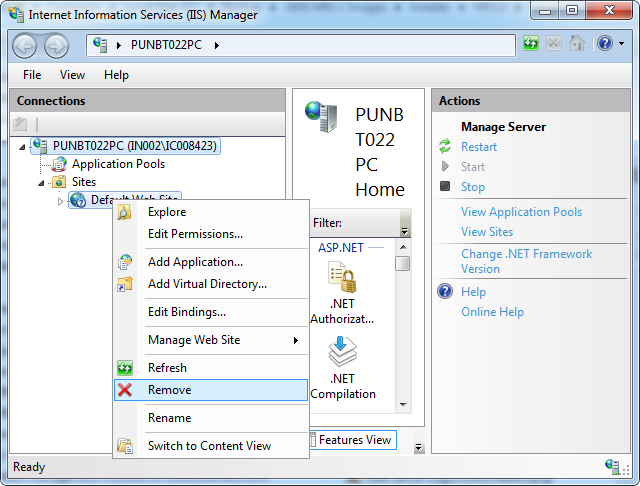 - Wählen Sie die Standard-Website, rechtsklicken Sie und wählen Sie dann Entfernen.