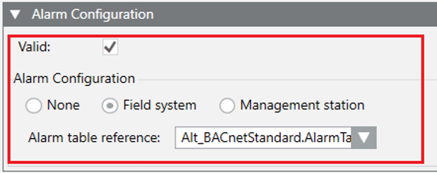 TableReference | Notwendig | Name der Alarmtabelle. Hinweis 1: In der leeren Zeichenkette (“TableReference”: “”), der Standardwert lautet 2. Hinweis 2: Der hier angegebene Name muss dem Namen eines Datenpunkts vom Typ „GmsAlarmTable_Driver“ entsprechen, der bereits im Projekt vorhanden ist. Wenn der angegebene Name keinem Datenpunkt im Projekt entspricht, wird der Standardwert (leere Zeichenfolge: “”) angenommen. Hinweis 3: Der hier angegebene Name kann das Suffix ".AlarmTable" haben oder nicht. Im letzteren Fall wird das Suffix automatisch hinzugefügt. |
