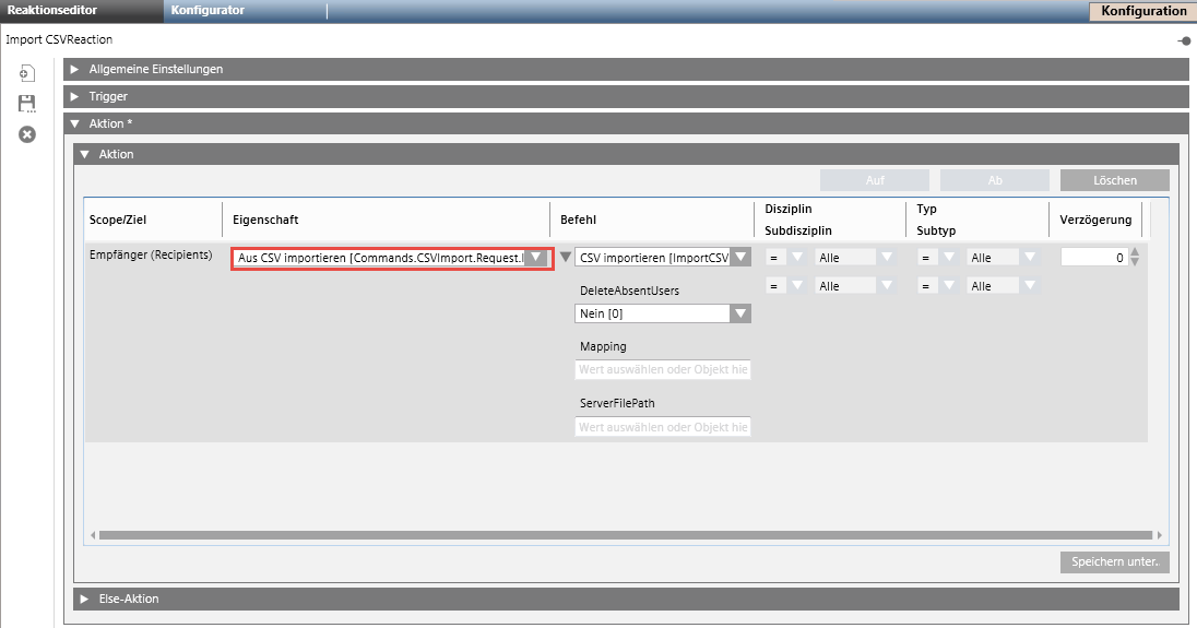 4. Wählen Sie aus der Dropdown-Liste Eigenschaft die Option CSV importieren [Commands.CSVImport.Request.Import].