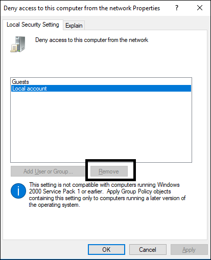- Überprüfen Sie Ihre lokale Richtlinie für Zugriff auf diesen Computer aus dem Netzwerk verhindern.