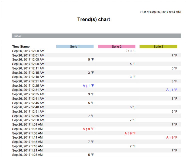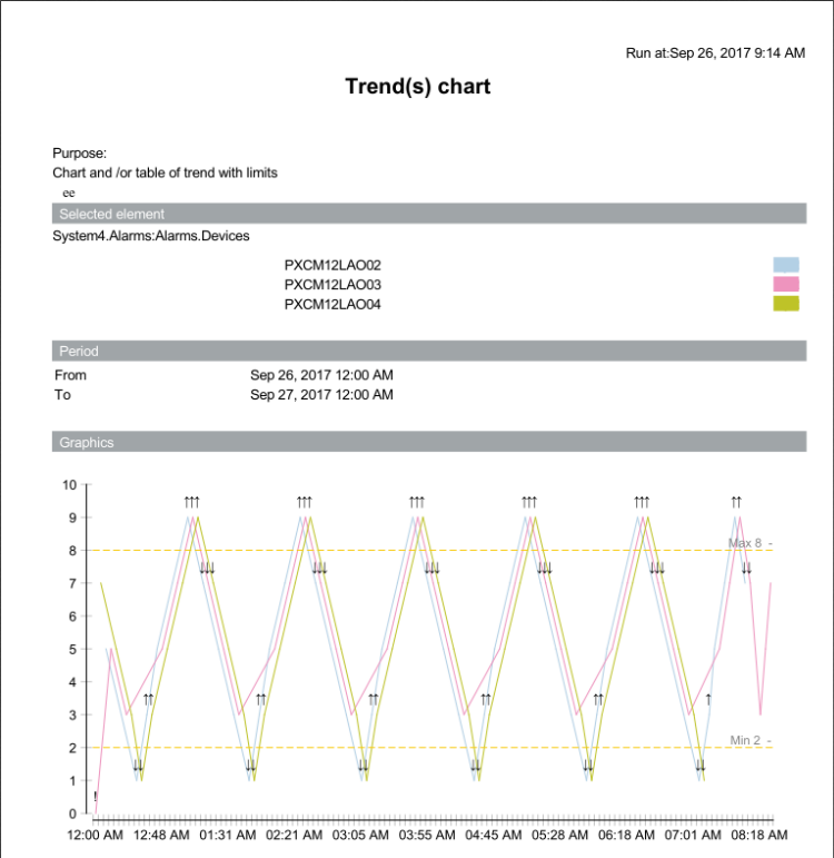 This report is designed to display a chart or table of trend data for multiple devices over a specified range of time.