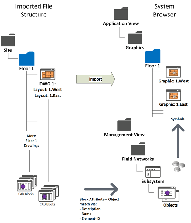 The import procedure replicates the subfolder structure under the Desigo CC Graphics folder of the Application View, and creates new Desigo CC graphics that contain the drawings as background.