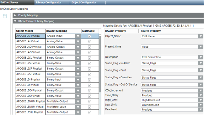 3. From the object models folder of the subsystem library, drag and drop object models you want to use with the BACnet server. Map the properties of the BACnet objects to the properties of your source objects. The following image shows an example of mapping to the APOGEE subsystem. You can provide specific values, or you can mark properties as not applicable if your subsystem does not have an equivalent property.