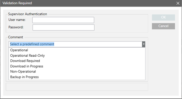 Dieser und der nächste Abschnitt zeigen zwei Dialogfelder für jedes Validierungsprofil. Das erste Dialogfeld erfordert einen vom Benutzer eingegebenen Kommentar. Das zweite Dialogfeld erfordert die Wahl eines Kommentars aus einer vordefinierten Liste. Welches Dialogfeld angezeigt wird, wenn Sie ein validiertes Objekt ändern oder darauf zugreifen, hängt davon ab, ob für das jeweilige Objekt vordefinierte Kommentare konfiguriert sind. Wenn keine vordefinierten Kommentare konfiguriert wurden, wird das erste Dialogfeld angezeigt. Wenn vordefinierte Kommentare konfiguriert wurden, wird ein dem zweiten Beispiel ähnliches Dialogfeld angezeigt.