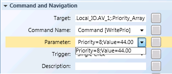 - Bei Befehlen mit mehreren Befehlsparametern über verschiedene Befehlssteuerungen hinweg. Zum Beispiel eine Numerische Steuerung für den Wert; eine Numerische Steuerung für die Priorität und eine Schaltfläche Senden, um die Eigenschaft Priority-Array zu kommandieren. Ein Benutzer editiert den Wert aller Parameter einzeln und sendet dann den Befehl mit allen Werten über die Schaltfläche Senden.