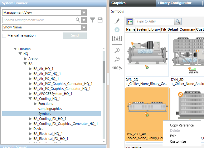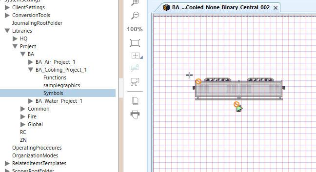 - Nach dem Neustart von Desigo CC, um die Änderung zu initiieren, aktualisiert das angepasste Symbol dynamisch alle Grafiken, in denen das Original-Symbol verwendet wurde, wenn es sich im Laufzeitmodus befindet.