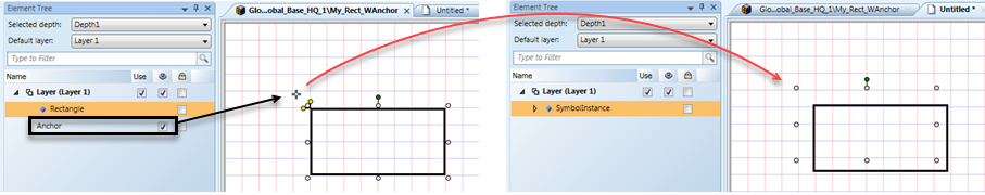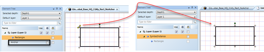 Wenn der Anker für das Symbol in der Elementstruktur auf sichtbar gesetzt ist, dient er im Raster als Referenz für das Symbol: Der Anker ist standardmässig auf dem Symbol nicht sichtbar. Wenn er jedoch auf „sichtbar“ gesetzt ist, dient er in einem Raster als Symbolreferenz.