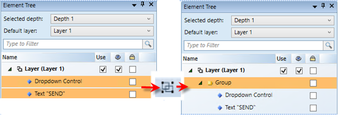 . - Text „SENDEN“ und Dropdown-Steuerung sind nun untergeordnete Elemente der Gruppe.