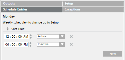 Sie erstellen einen wöchentlichen Zeitplan aus der Dropdown-Liste Subtyp des Registers Konfiguration. Der letzte Zustand des Tages wird nach 24:00 Uhr erst beibehalten, wenn der Eintrag des Tageszeitplans für den Folgetag ausgelöst wird.