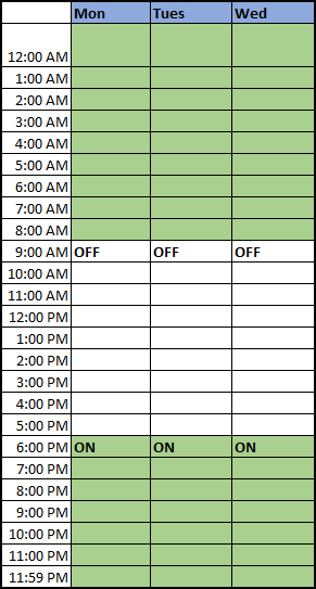Zeitraum für den Zeitplan (Aktiv: 12:00 a.m., Inaktiv: 9:00 Uhr, Aktiv: 18:00 Uhr)