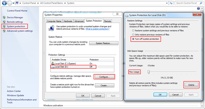 - Wählen Sie im angezeigten Fenster Systemeigenschaften das Laufwerk aus und klicken Sie Konfigurieren.