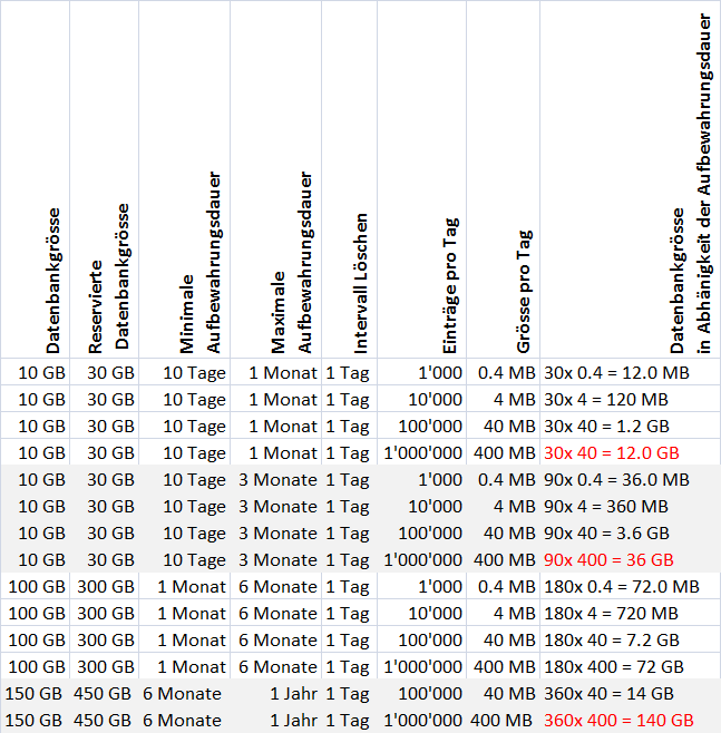 Weitere Informationen über das Berechnen der Datenbankgrösse und der Zeitspanne siehe Werte und Datenkapazitätseinstellungen.