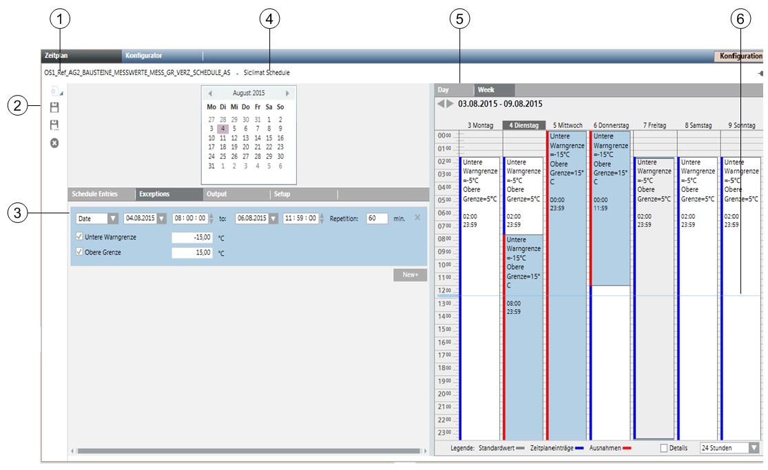 Mit der Zeitplanungsfunktion können Sie tägliche oder wöchentliche Pläne für Ihre SICLIMAT X-Objekte erstellen, wobei die Managementstation mehrere Kalender oder Zeitpläne gleichzeitig ausführen kann. Sie können auch Ausnahmen von Zeitplänen angeben. Wenn eine Ausnahme aktiv ist, wird damit der Wochenzeitplan übersteuert. Ist die Ausnahme inaktiv, übernimmt der Wochenzeitplan wieder die Steuerung.