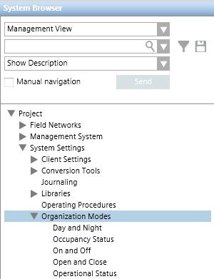 Der Zugriff auf die Betriebsarten erfolgt in der Managementsicht des System Browsers, unter Projekt > Systemeinstellungen > Betriebsarten.
