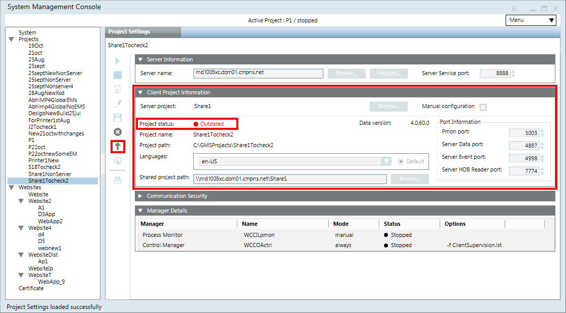 Sollte im Expander Serverprojektinfo weiterhinVeraltet(rot) angezeigt werden, müssen Sie den zugehörigen Hauptprojektordner auswählen und den Projektstatus aktualisieren. - Systemname wird als