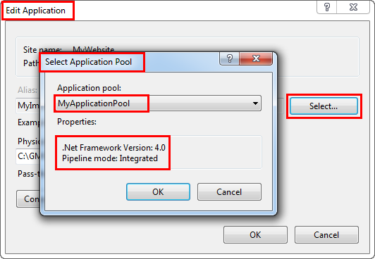 3. Stellen Sie sicher, dass im Dialogfeld Applikation wählen die Version von Applikationspool: .Net Framework Version und Managed Pipeline Mode mit der Version auf dem Quellcomputer identisch ist.