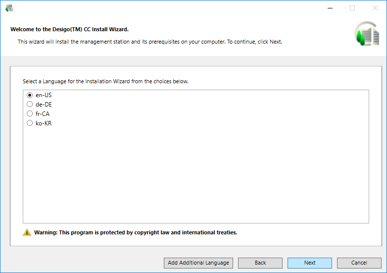 Übernehmen Sie die standardmässig ausgewählte Sprache. Als Standardsprache wird die Installationssprache des Betriebssystems verwendet, wenn das relevante Sprachpaket verfügbar ist; andernfalls wird en-US verwendet. Das Startfenster des Installationsassistenten von Desigo CC und alle zugehörigen Meldungen werden jedoch immer in der Sprache en-US angezeigt.