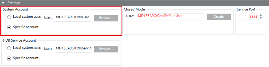 - Lokales Systemkonto (Standardauswahl): Durch die Option Lokaler Benutzer wird der schreibgeschützte Standardwert für [Maschinenname\SYSTEM] festgelegt.