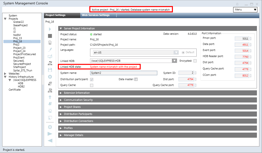 Der Systemname in der HDB unterscheidet sich vom Systemnamen des Projekts, mit dem die HDB verknüpft ist.