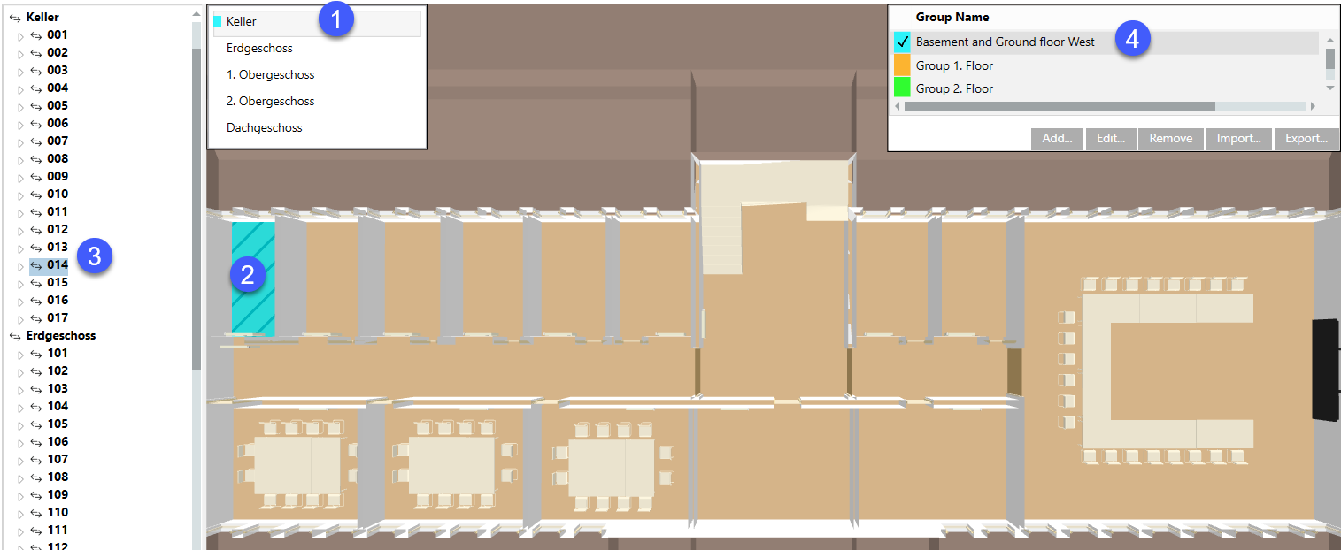 - Drag the room from the BIM room hierarchy (3) to the new group (4).